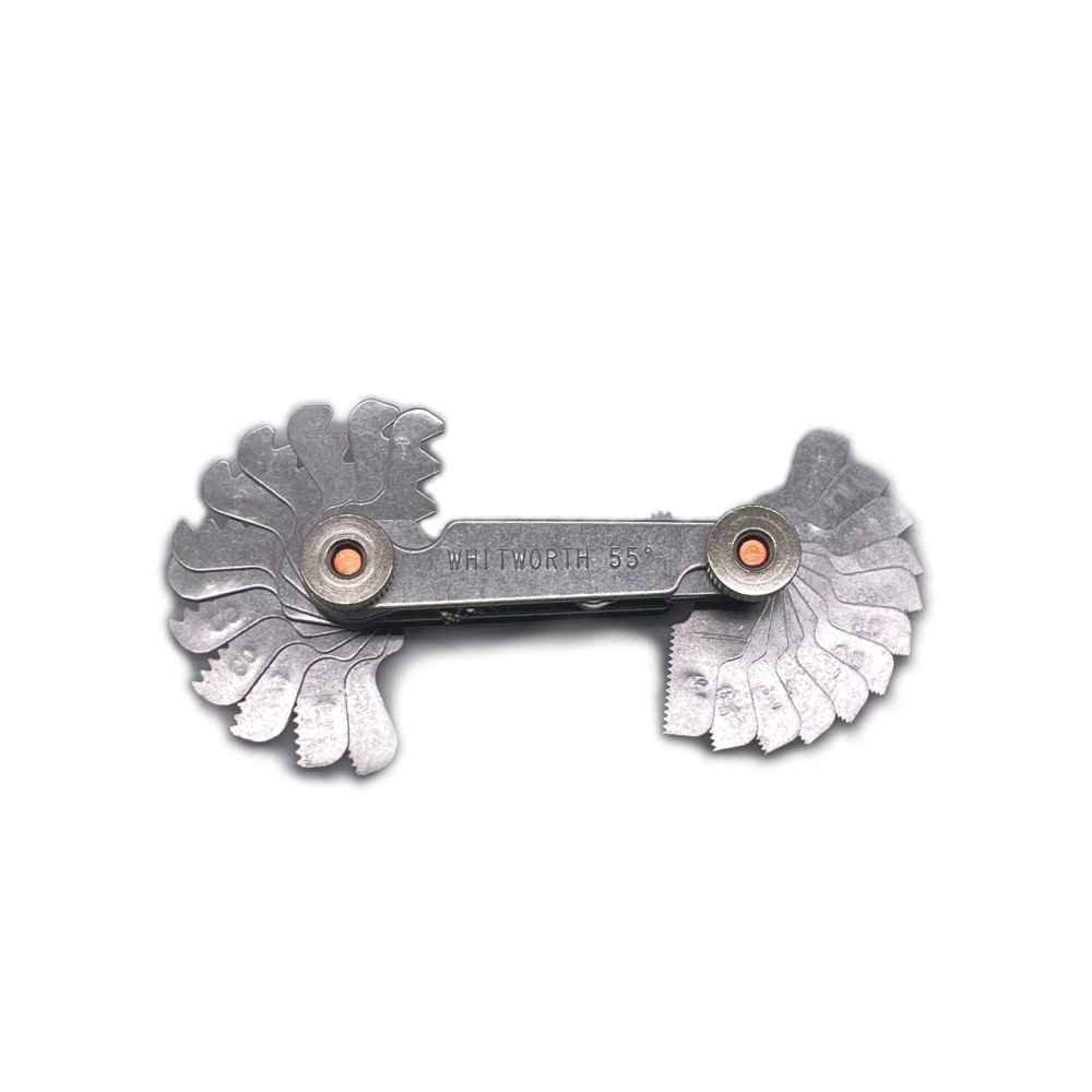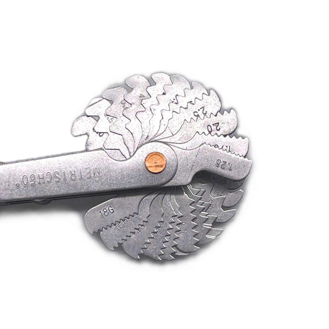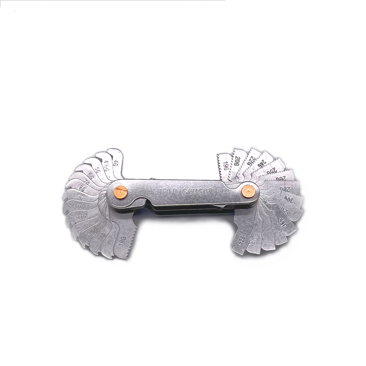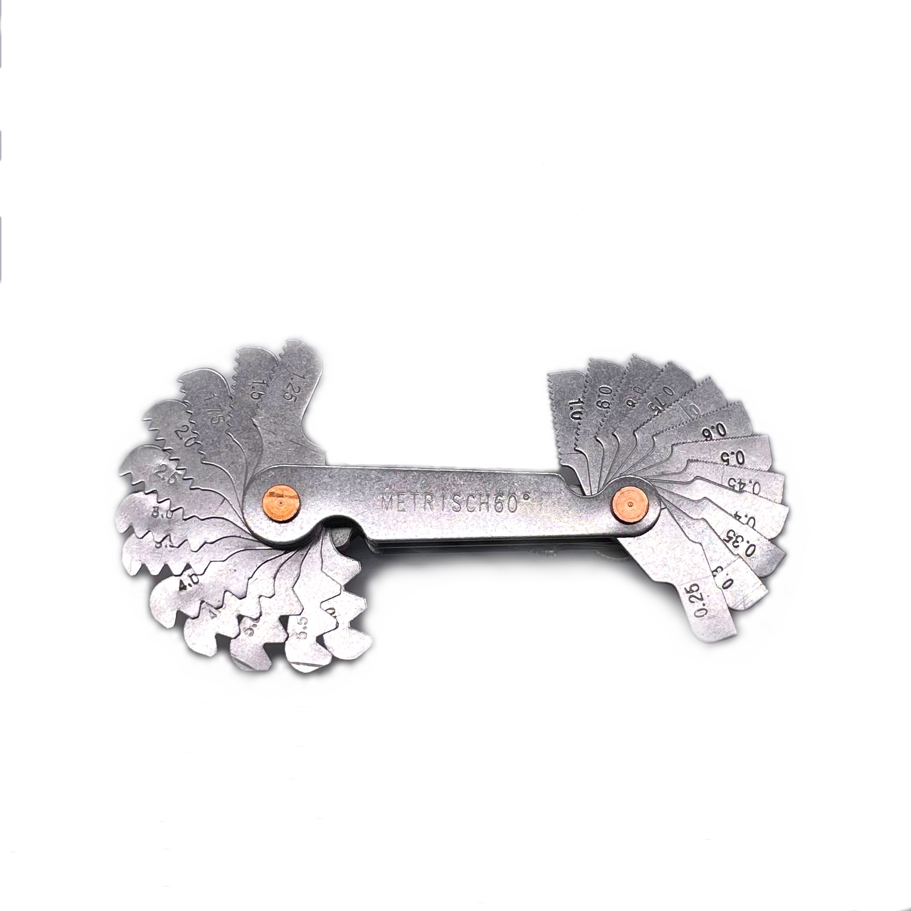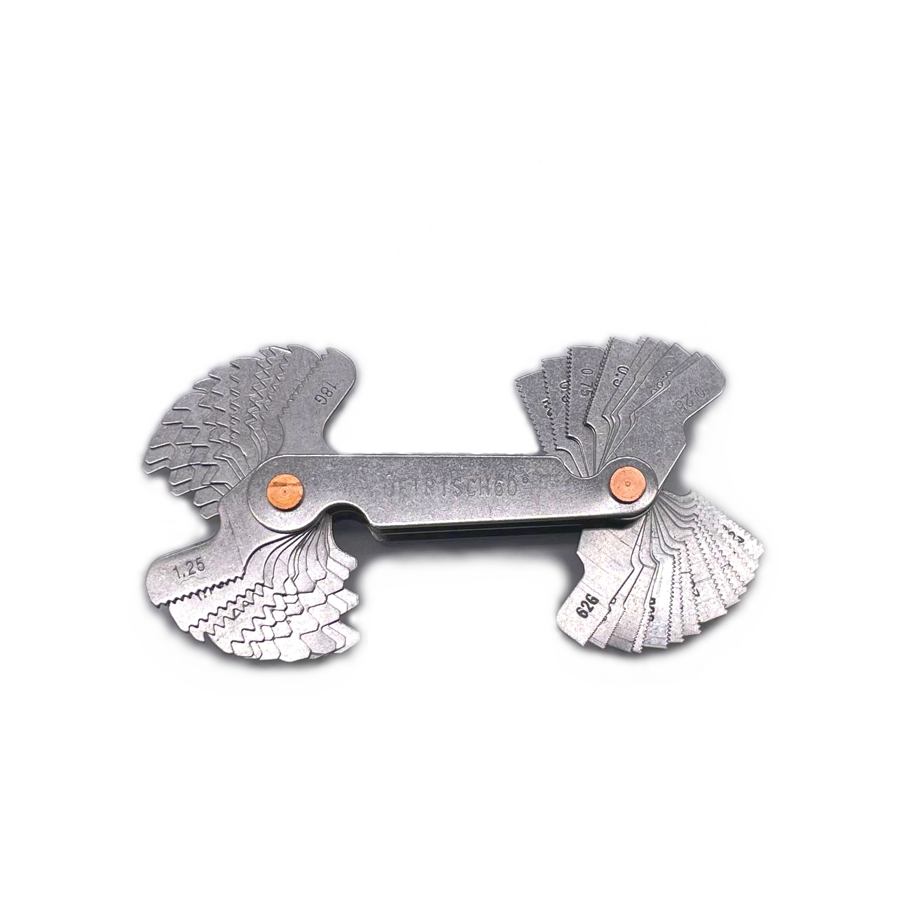 Резьбомер представляет собой набор из 24 эталонных шаблонов, используемых для определения шага метрической резьбы и из 28 эталонных шаблонов для определения шага дюймовой резьбы.