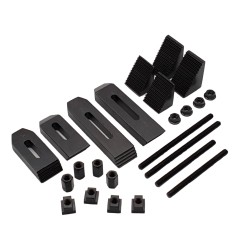 Набор прижимов М18 (58шт) Комплект приспособлений для фиксирования на столах с Т-пазами шириной 19,7 мм (под шпильки М18). Детали набора изготовлены из стали и упрочнены. Может использоваться на столах фрезерных, расточных, сверлильных станках, обрабатывающих центрах и прочем оборудовании. Состав набора Шесть пар уголков "лесенок" различных размеров Три пары прихватов различных размеров Шесть Т-гаек для пазов стола Четые дистанционные гайки Шесть зажимных гаек По 4шт шпильки шести разных длин Подставка для размещения деталей набора